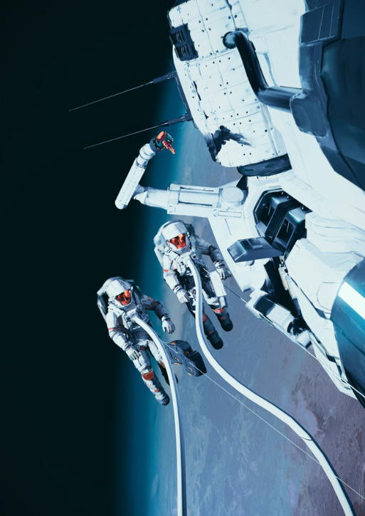 Bild zum Pioneer RPG, bei dem 2 Astronaiten außerhalb eines Raumschiffs im All schweben